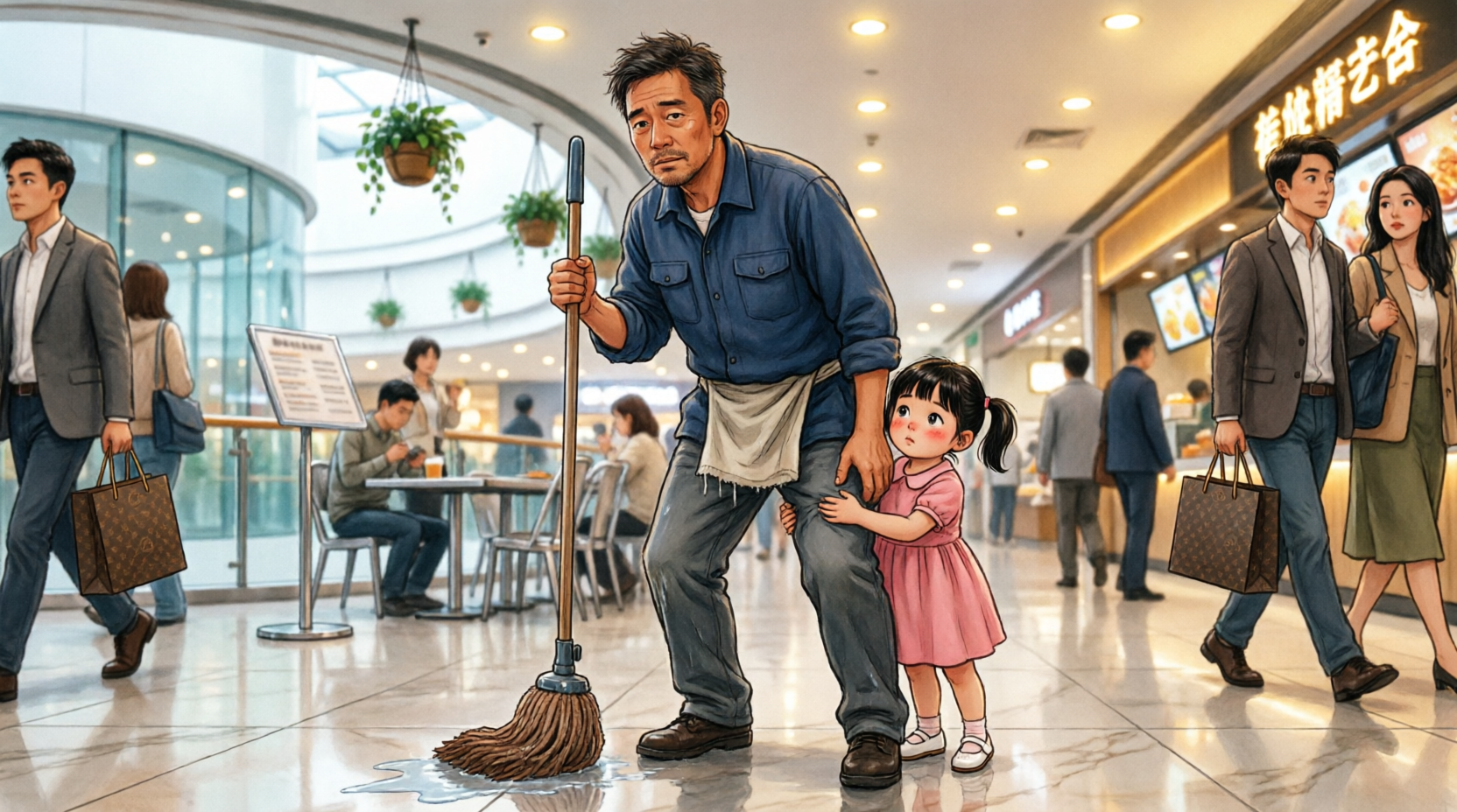 Arthur was just trying to finish his shift. He was a massive man, standing six-foot-four, with a thick beard and a jagged burn scar covering the left side of his face. He wore a faded blue work uniform, carrying a heavy mop bucket through the bustling food court of the local shopping center.