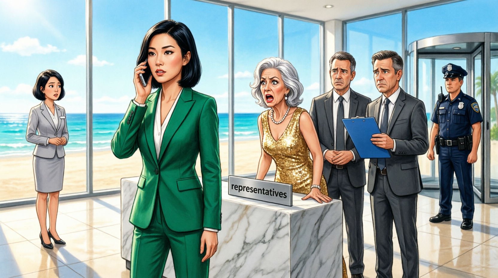 The lobby fell silent, the sound of ocean air drifting through the doors.