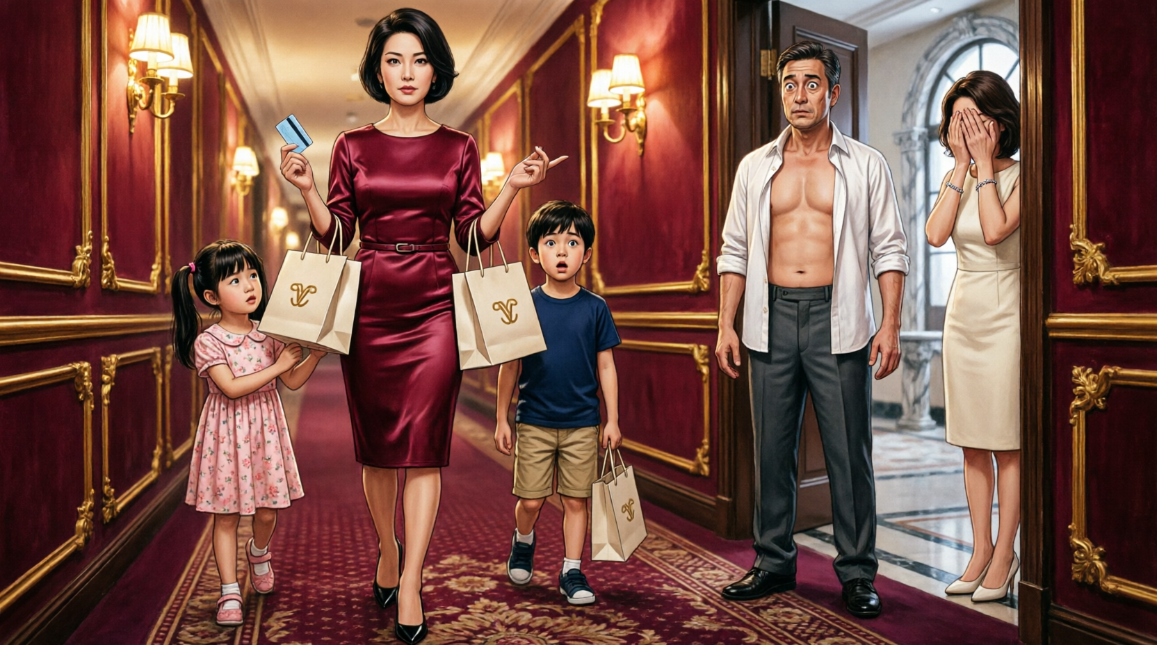 You stand in the doorway of room 608 with shopping bags cutting into your fingers, your daughter’s hand still warm in yours, your son’s confused little voice still hanging in the air, and suddenly the whole hallway feels too narrow to hold what is happening.