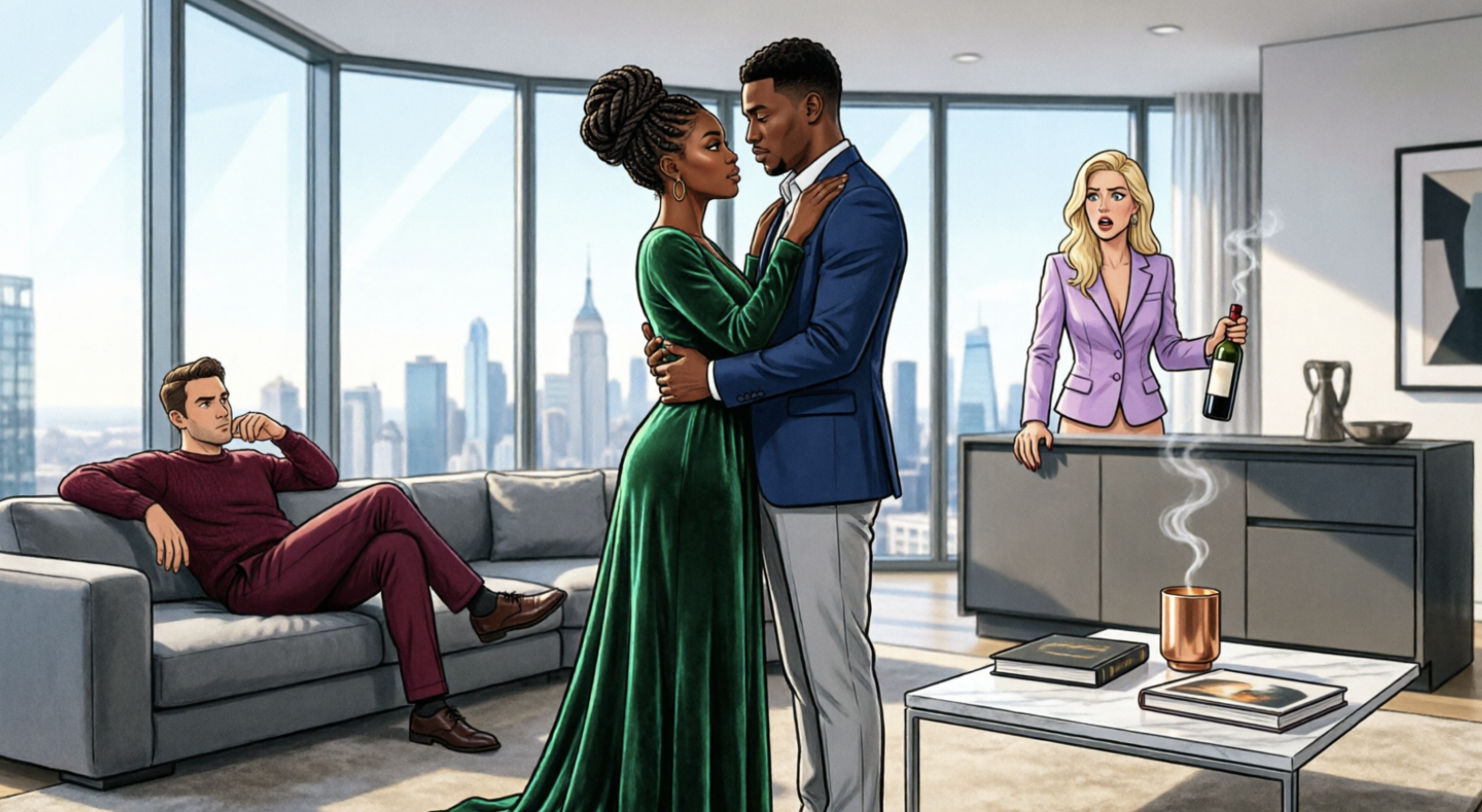 Funmi stood awkwardly near the kitchen island, still holding her wine glass like she suddenly wished she were anywhere else.